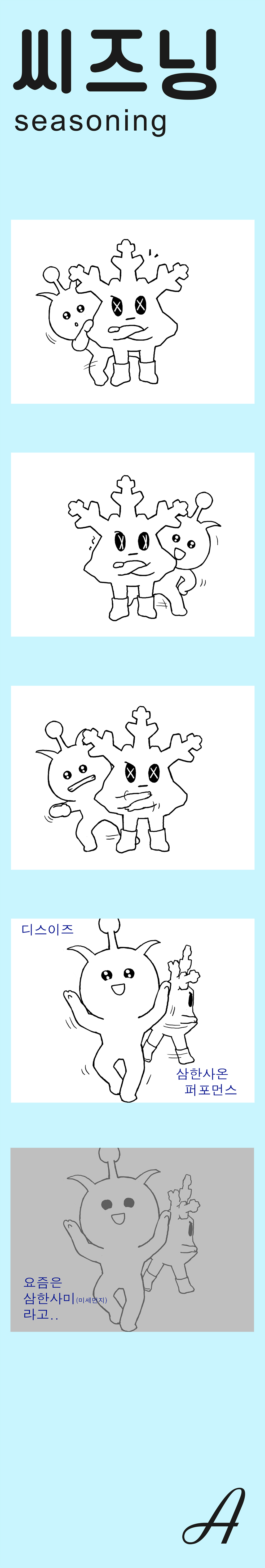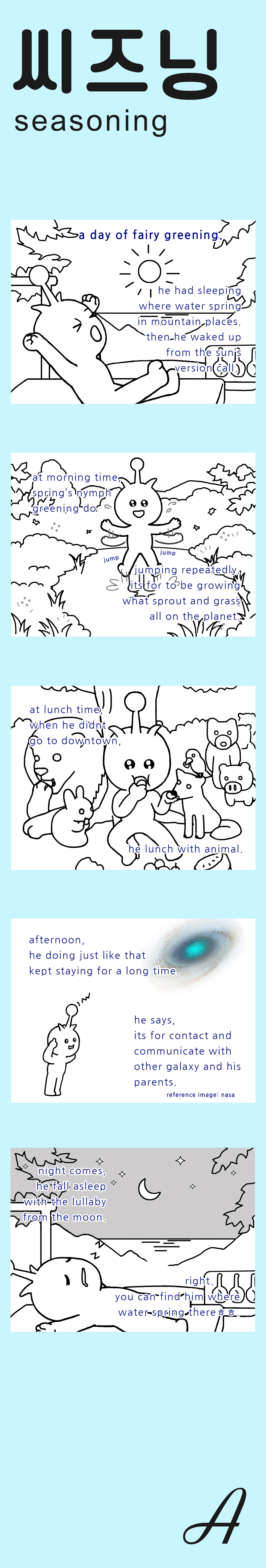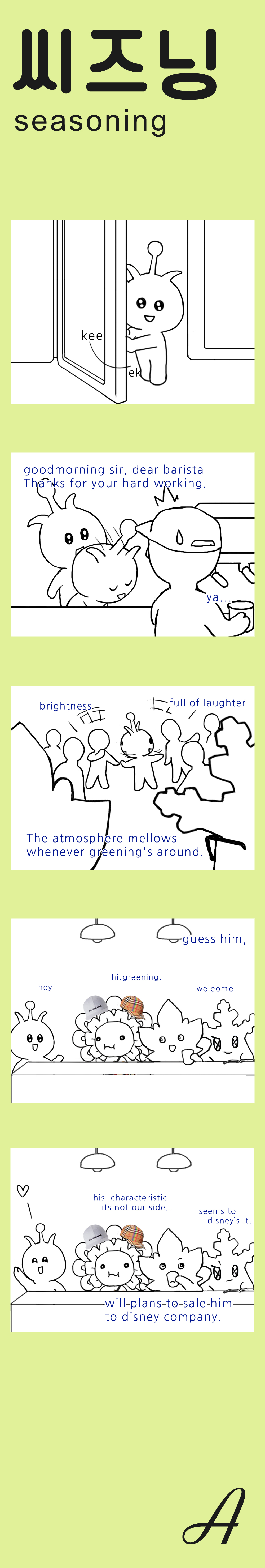 봄 대표? 새싹 요정?이다. 천진난만해서 사람의 행동을 따라한다. 통통 뛰면 싹이 나와 자란다. 머리의 풀은 개수가 변하며 우주와 소통하는 안테나라고.